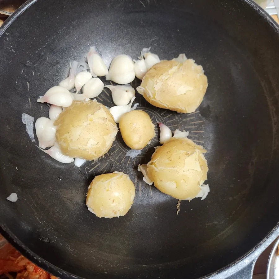 풀을 뽑다 달려 나온 작은 마늘을 감자가 거의 익어갈 무렵 쪼개어 넣었어요.