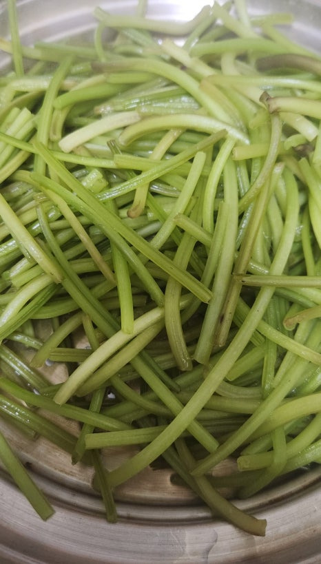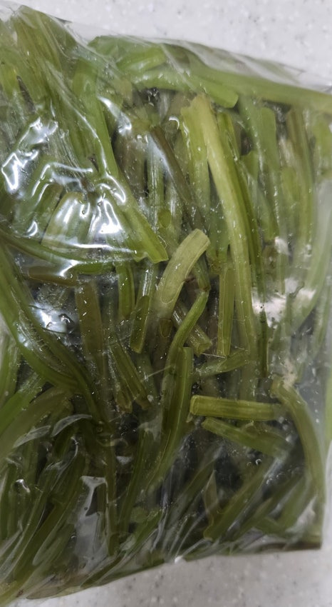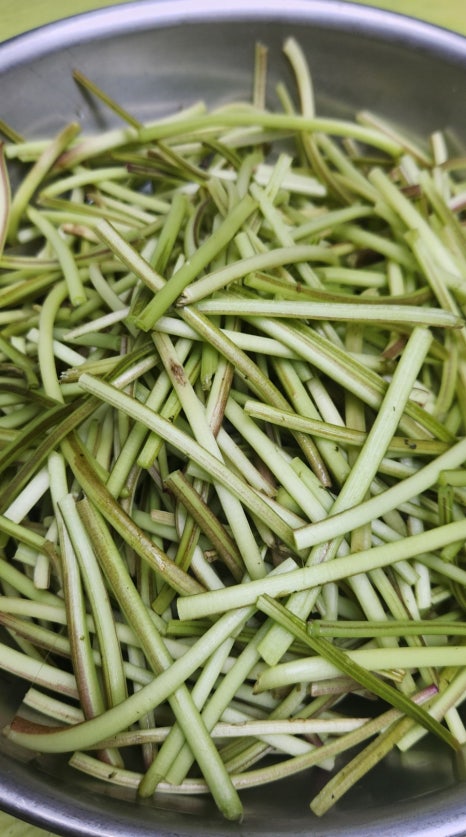 - 찬물에 씻어 탱탱한 고구마 줄기를 먹기 좋은 크기로 잘라 줍니다.
