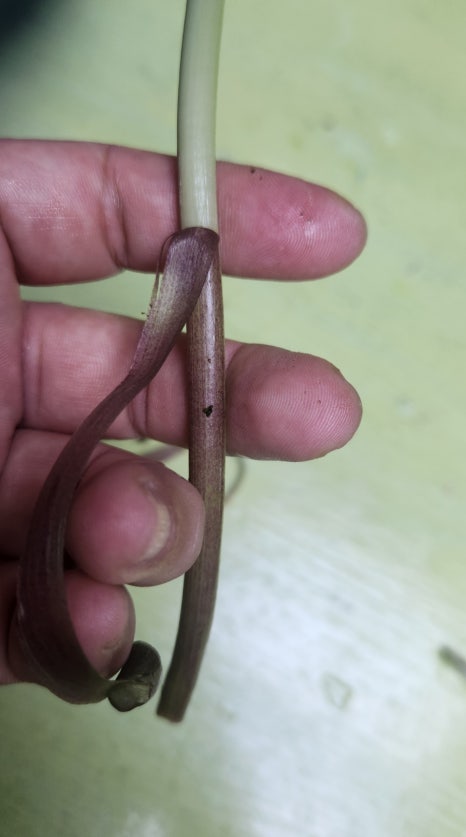 요렇게 줄기를 꺾어서 껍질을 벗깁니다. 고구마 줄기를 톡 반으로 꺾으며 딸려 나오는 껍질을 부드럽게 벗깁니다. 살살 달래며 딸려 나오는 껍질을 보는 재미도 쏠쏠합니다. 완전하게 끊지 말고 붙어 있는 껍질을 벗기면 됩니다.
