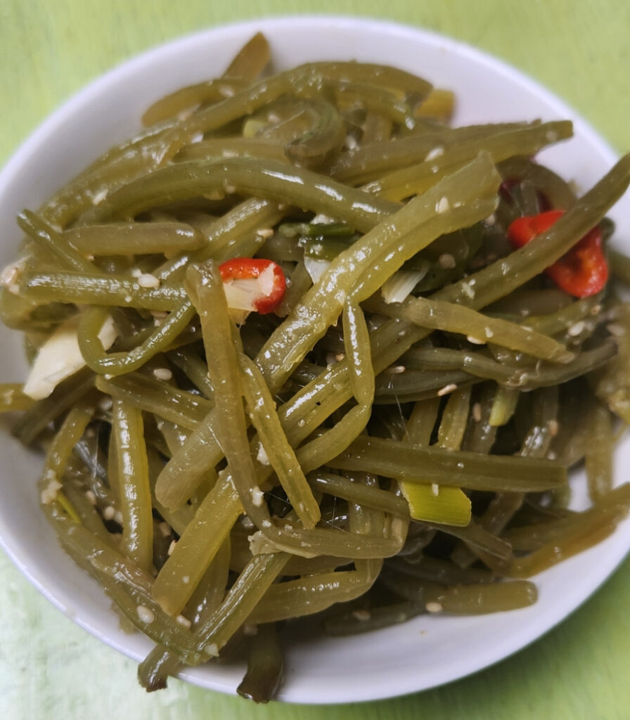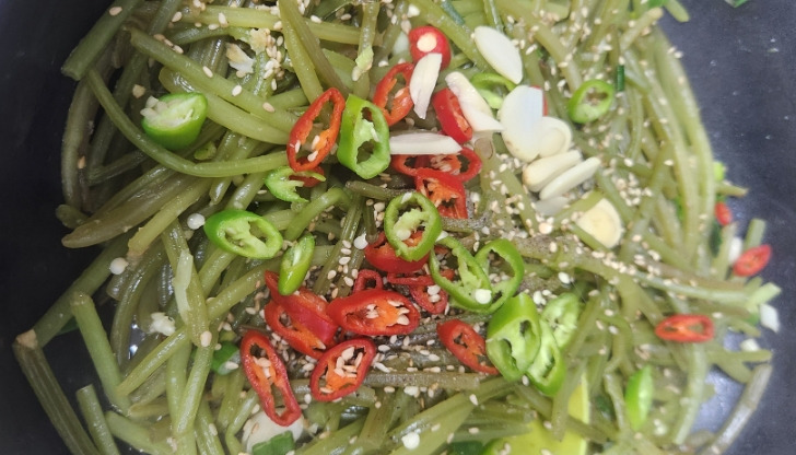 샤워는 찬물로~ 오늘 저녁 반찬은 고구마 줄기 볶음입니다. 엄마가 많이 만들어 준 고구마 줄기 볶음 간장 맛입니다.