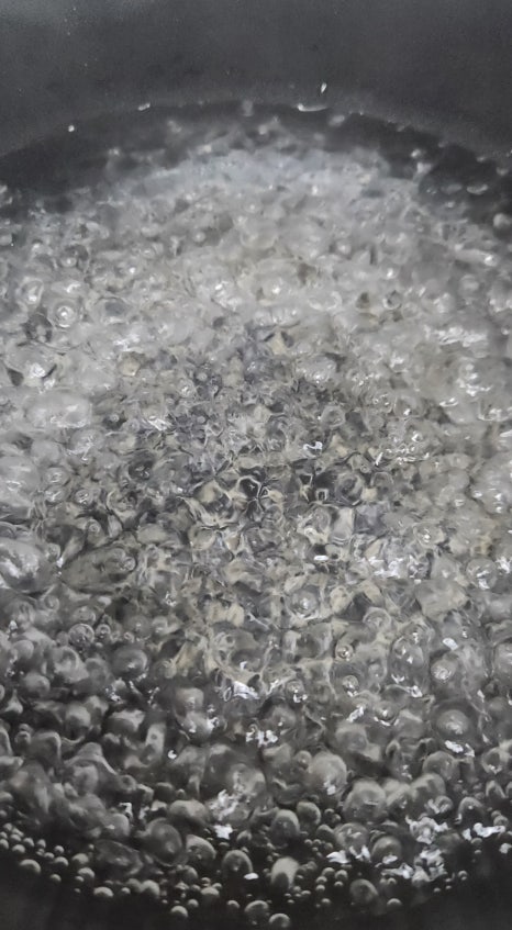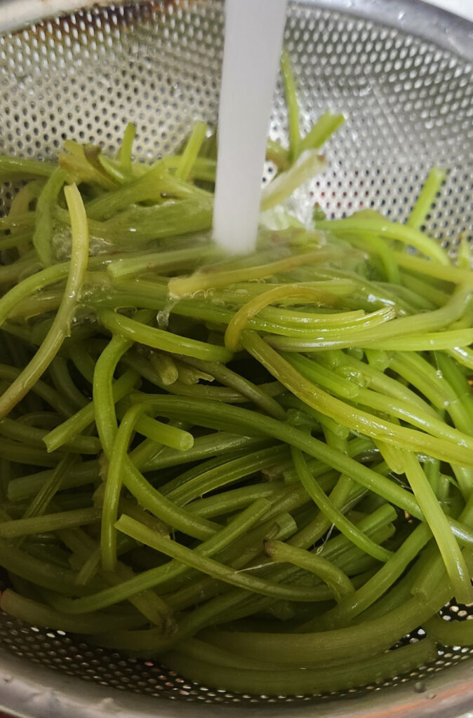 물이 보글보글 끓으면 소금을 약간 넣고 고구마 줄기가 잠기도록 삶아 줍니다. 약 5분 정도 삶고 찬물에 시원하게 샤워~