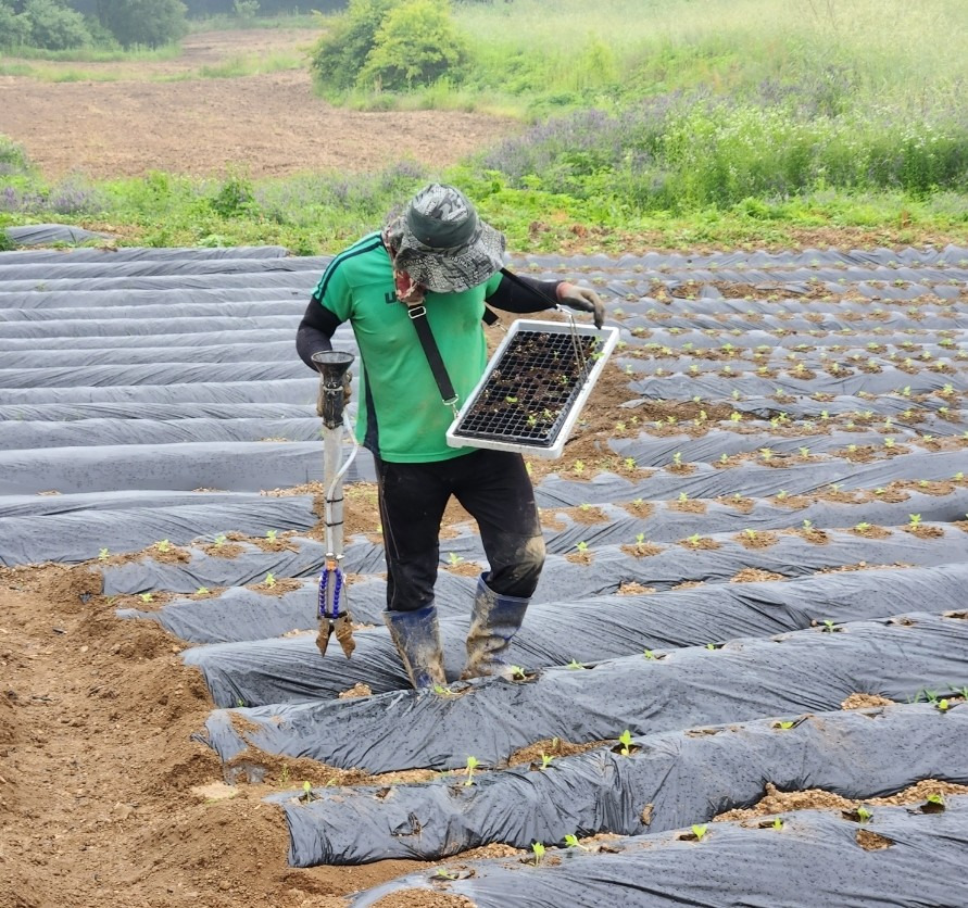 - 이식기를 비닐 멀칭에 푹~ 넣어요.
