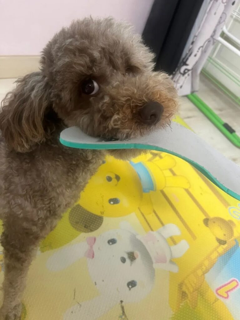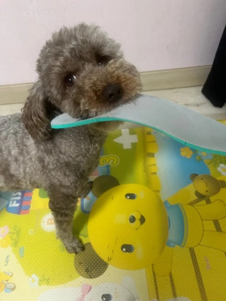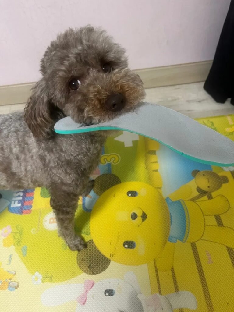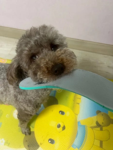 아주 폭신한 깔창을 야무지게 물어 뜯어요. 얼른 잡아야 합니다.