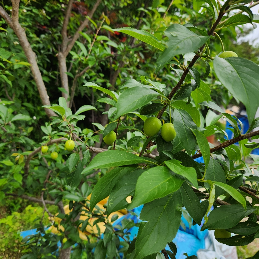 기다리던 바이오 체리 꼭 자두 같아요. 익으면 진한 피자두 같은 색으로 변신하는 바이오 체리입니다. 크기는 체리 크기보다 살짝 큰 크기에요.