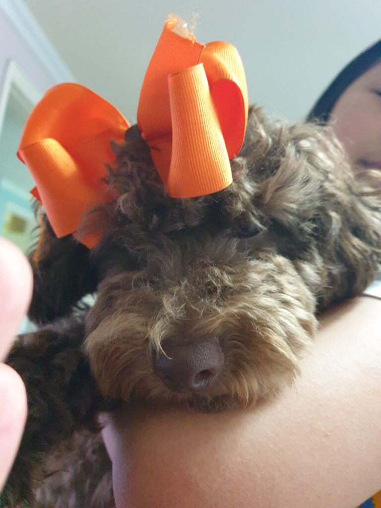 엄마가 2호의 주황색 리본을 머리에 꽂았어요. 너무 싫은데 반항도 못하고 하고 있는 달달한 마루 씨입니다. 엄마는 이쁜데~ 마루는 싫어요.
