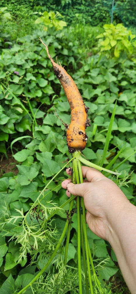 저는 모종으로 키워~ 한꺼번에 심었더니 서로 붙어서 저렇게 사이좋은 당근을 얻었어요. 당근🥕 싹이 나오면 꼭~ 솎음을 해서 예쁜 당근을 수확하세요. 예전 밭에 파종했을 때 싹이 올라오지 않아서 모종으로 만들었거든요. 저는 모종이 더 편한 것 같아요. ^^ 싹이 오르기까지 충분하게 물을 주기도 편해서 모종이 더 좋은 것 같아요.