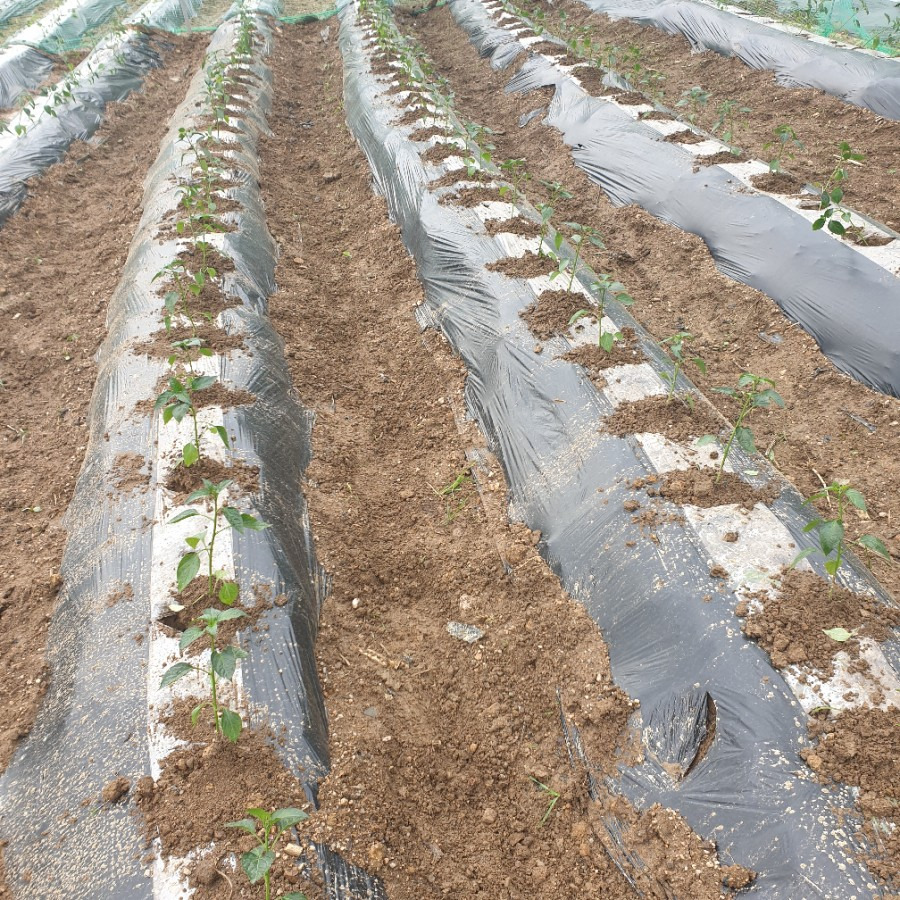 밭에 고추 모종을 심었어요.