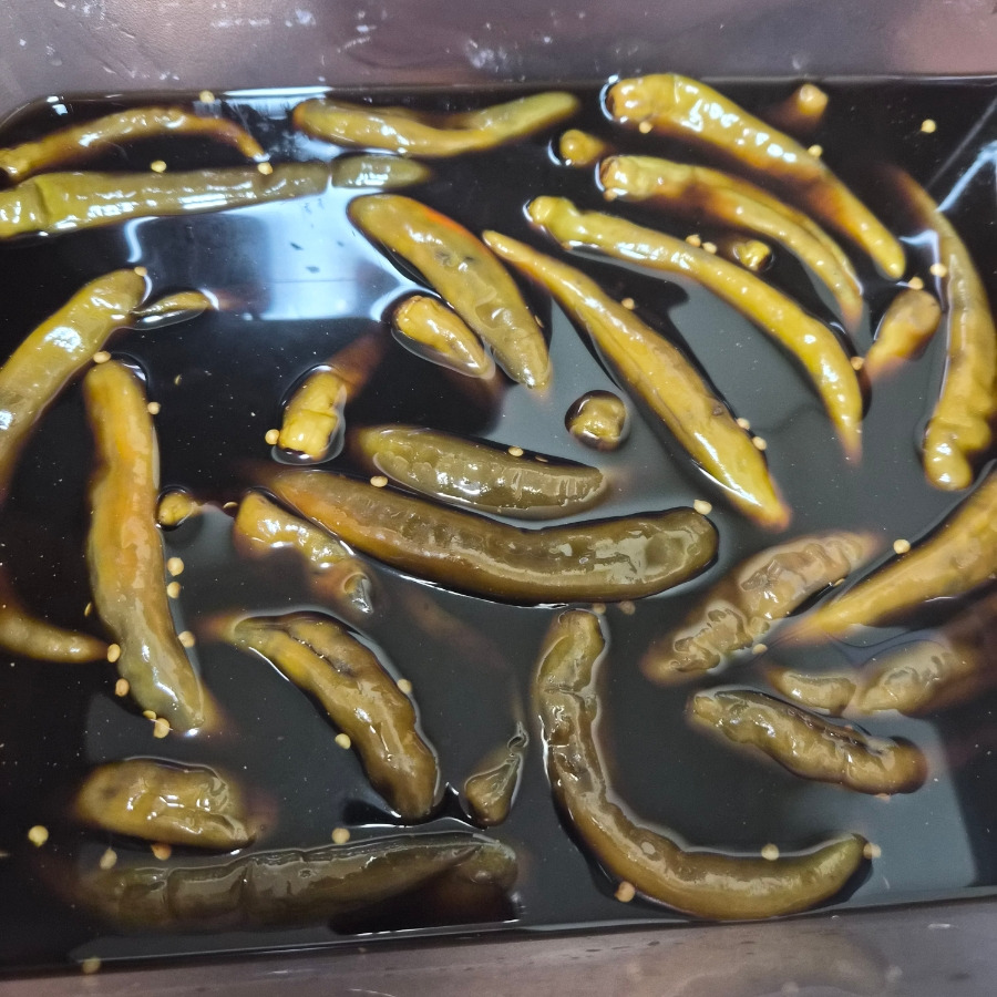 간장의 맛은 잘 들었어요. 아삭하니 맛났어요. 짠맛도 좋고요. 색이 좀 아쉽네요. 우리가 알고 있는 고추 장아찌의 진한 색은 아닙니다.