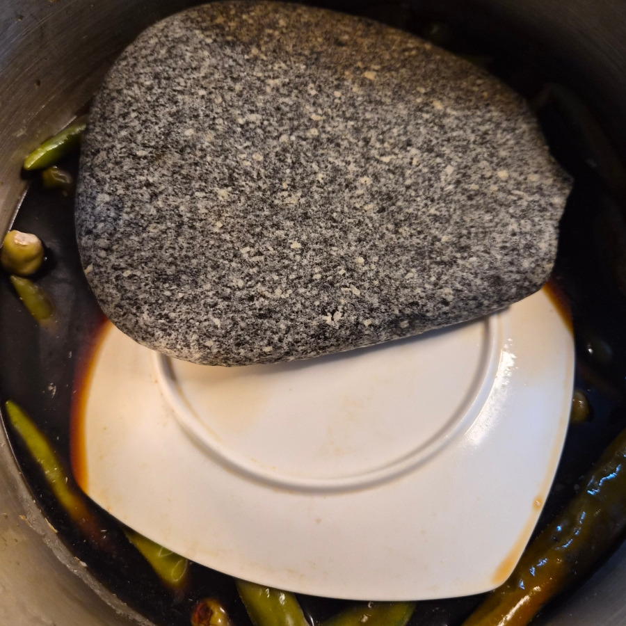 주의 사항으로 꼭 눌러서 위로 올라오지 않고 간장 물에 잠길 수 있도록 하는 것이 방법입니다. 어려운 것이 없어도 너무 없죠? 누구나 할 수 있어요. 요리를 잘 알지 못하는 분들도 간편하게 만들 수 있는 장아찌용 간장입니다.