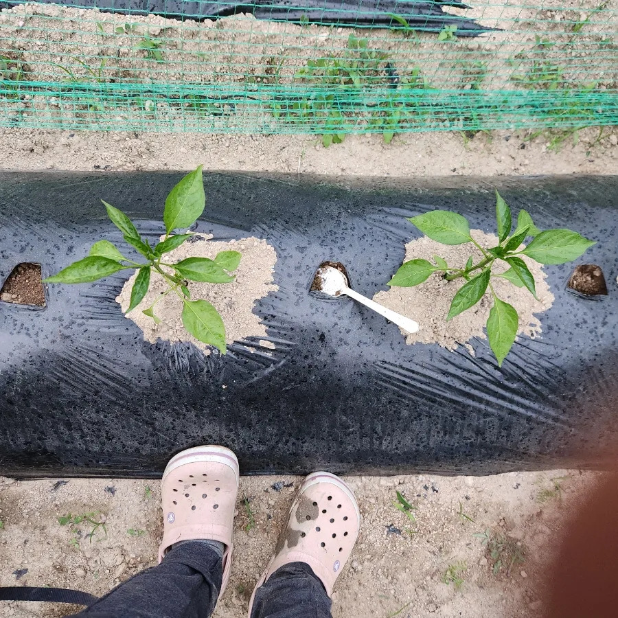 고추와 고추 사이 중간에 넣어 주었어요. 작물들에게 닿지 않도록 주의하면서 넣었어요.