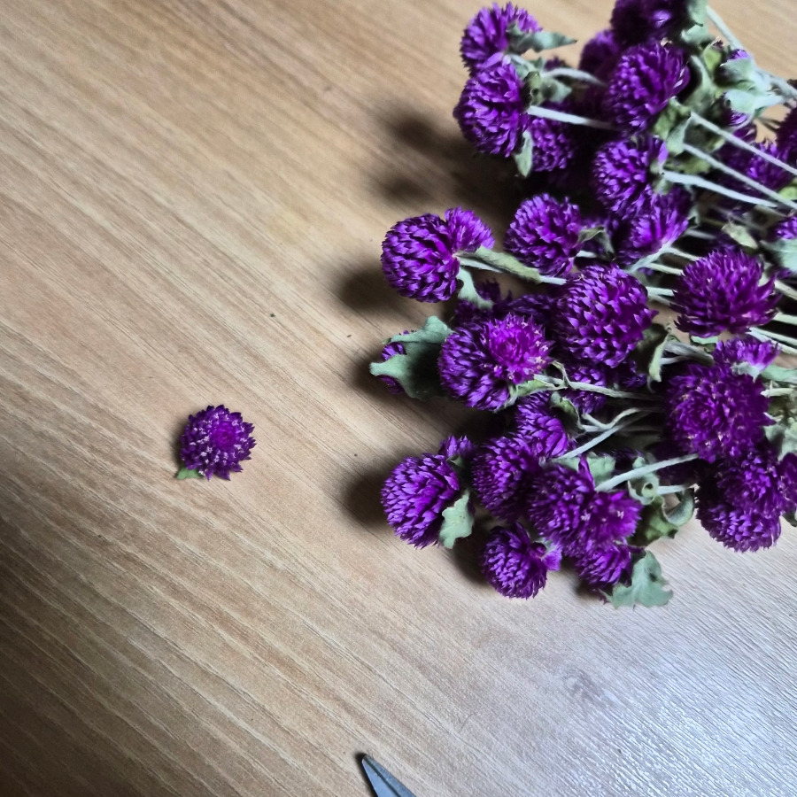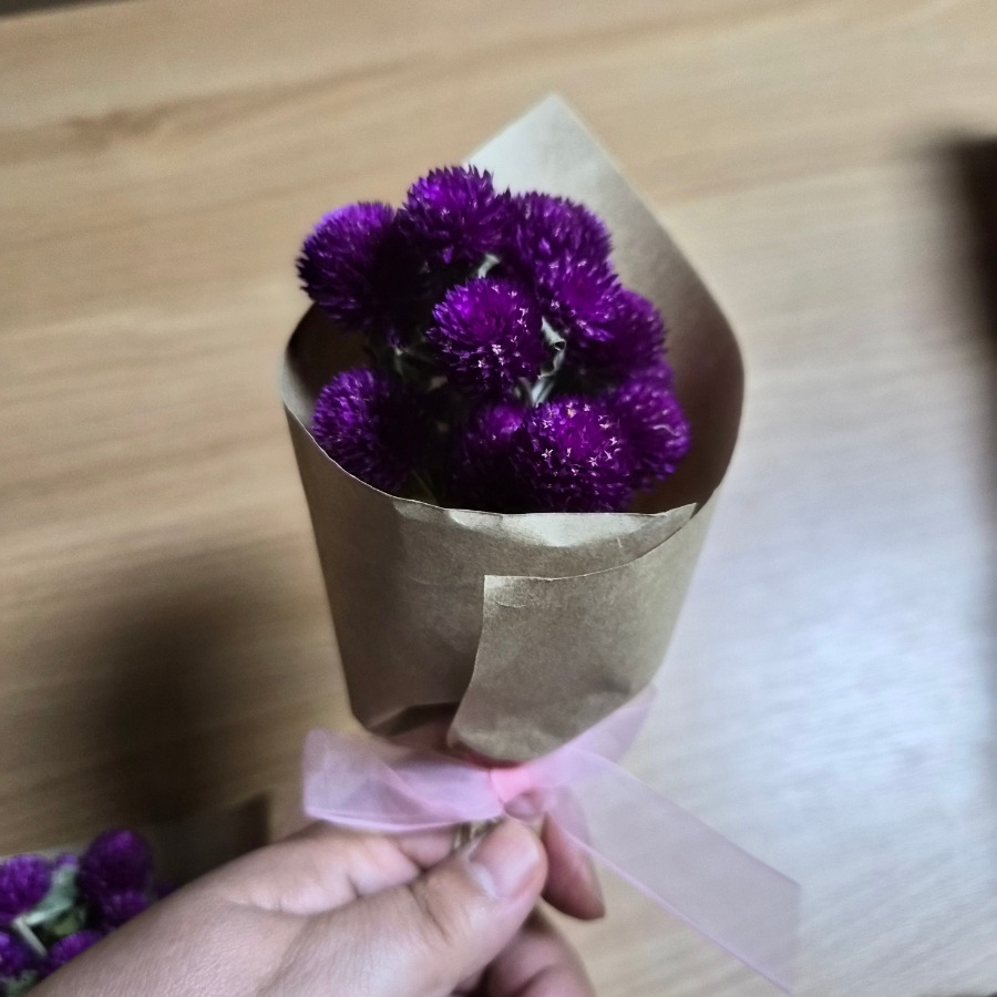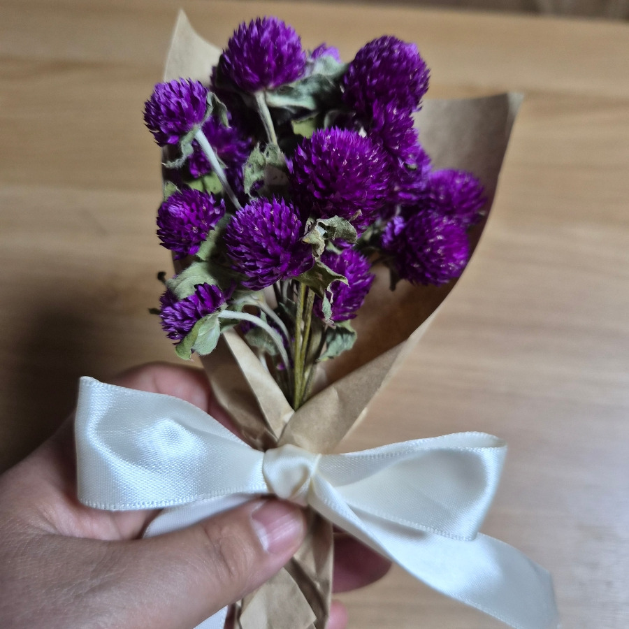 그리고 남은 천일홍으로 작은 꽃다발을 만들었어요. 집에 있는 리본 모두 총출동~