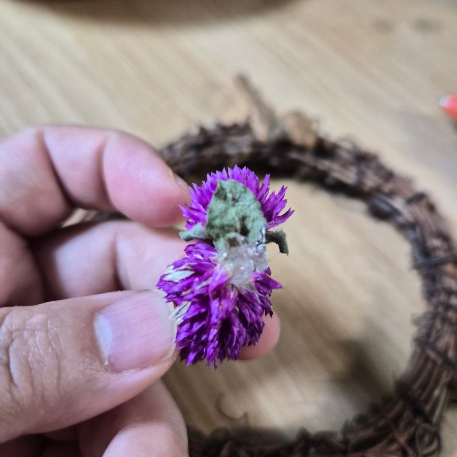 꽃송이 뒤에 글루를 쏘아서 얼른 리스 틀에 붙입니다.