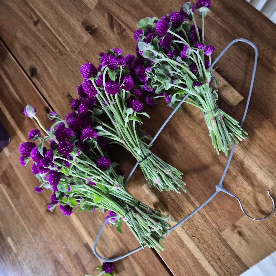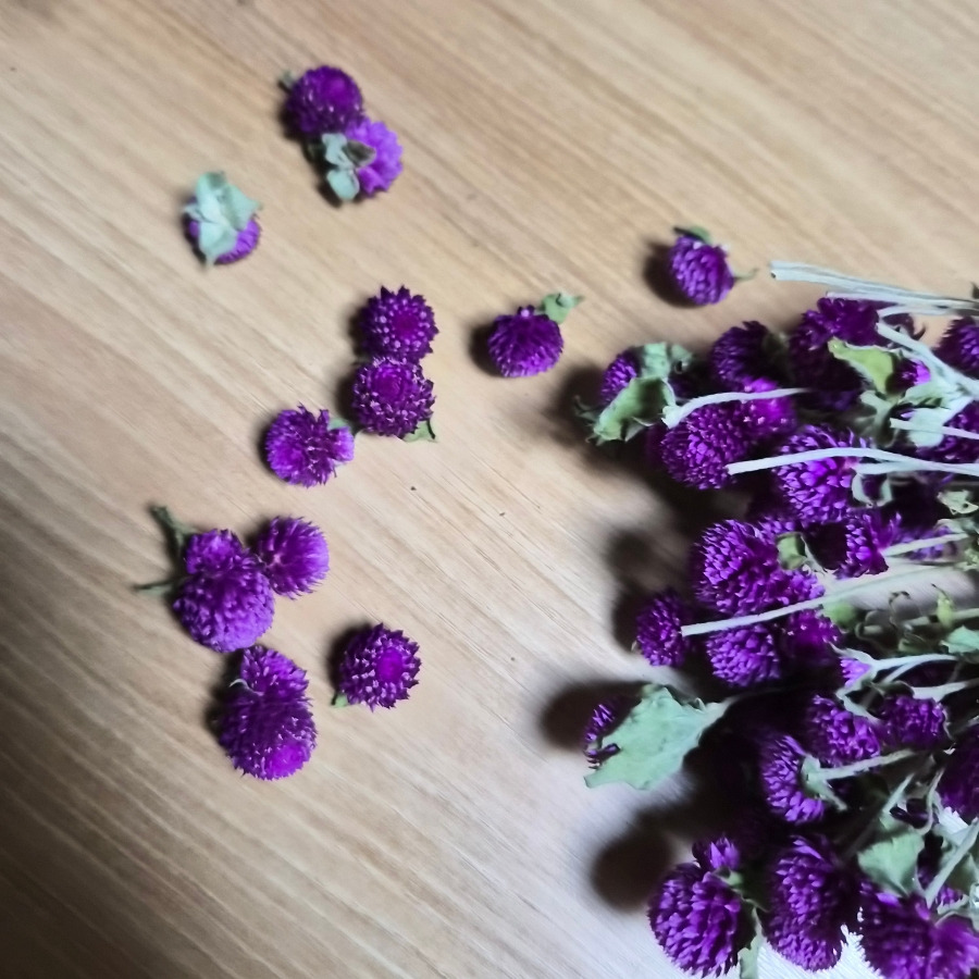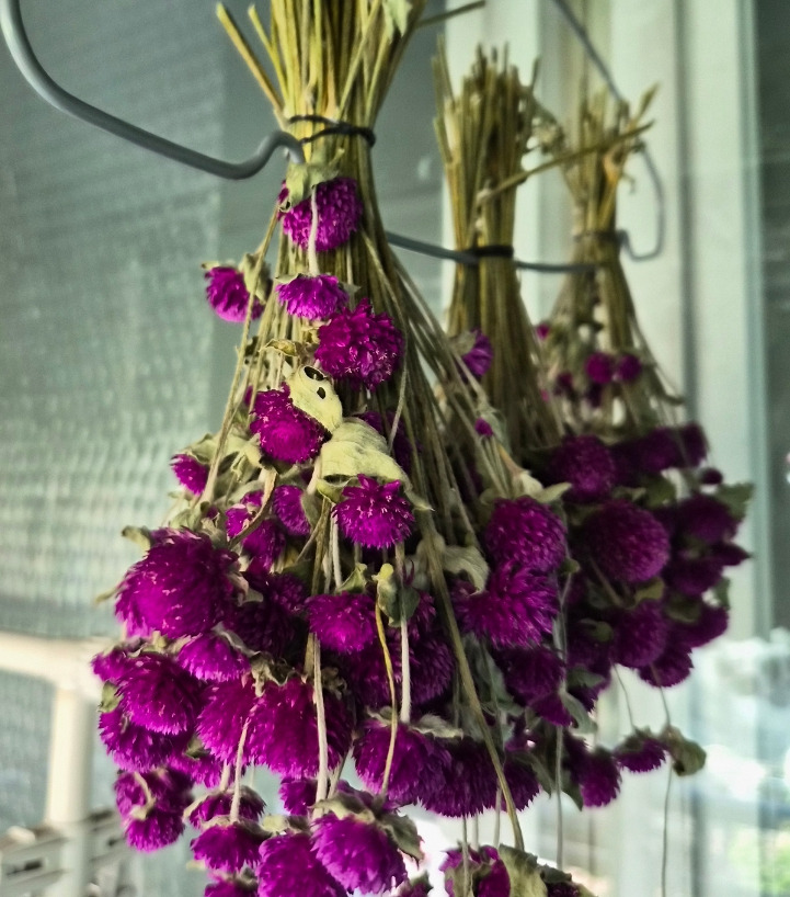 달달한 마루 씨네 밭의 천일홍을 9월 14일 베란다에서 말리기 시작했지요. 그리고 9월 26일 드디어 보송하니 말랐어요. 요렇게 묶어서 옷걸이에 걸어 바람이 잘 통하는 그늘에서 말렸어요. 시원한 바람을 맞으며 곱게 말랐어요. 거꾸로 매달아 매일 들여다보면서 마르는 것을 확인했어요.