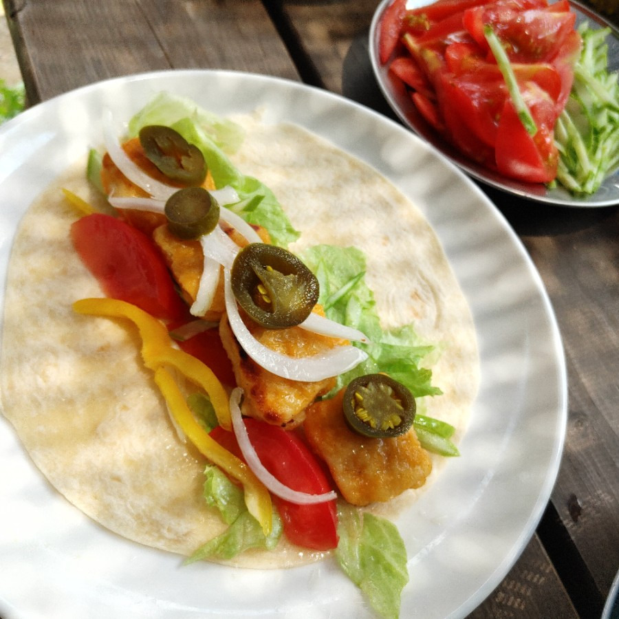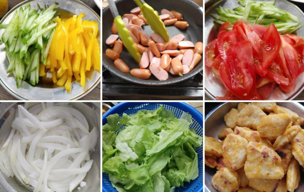 재료 : 오이, 파프리카, 소세지, 토마토, 또띠아,양상추, 양파, 치킨너겟, 할라피뇨, 마요네즈, 케첩, 허니머스터즈, 매실청, 얼음, 물