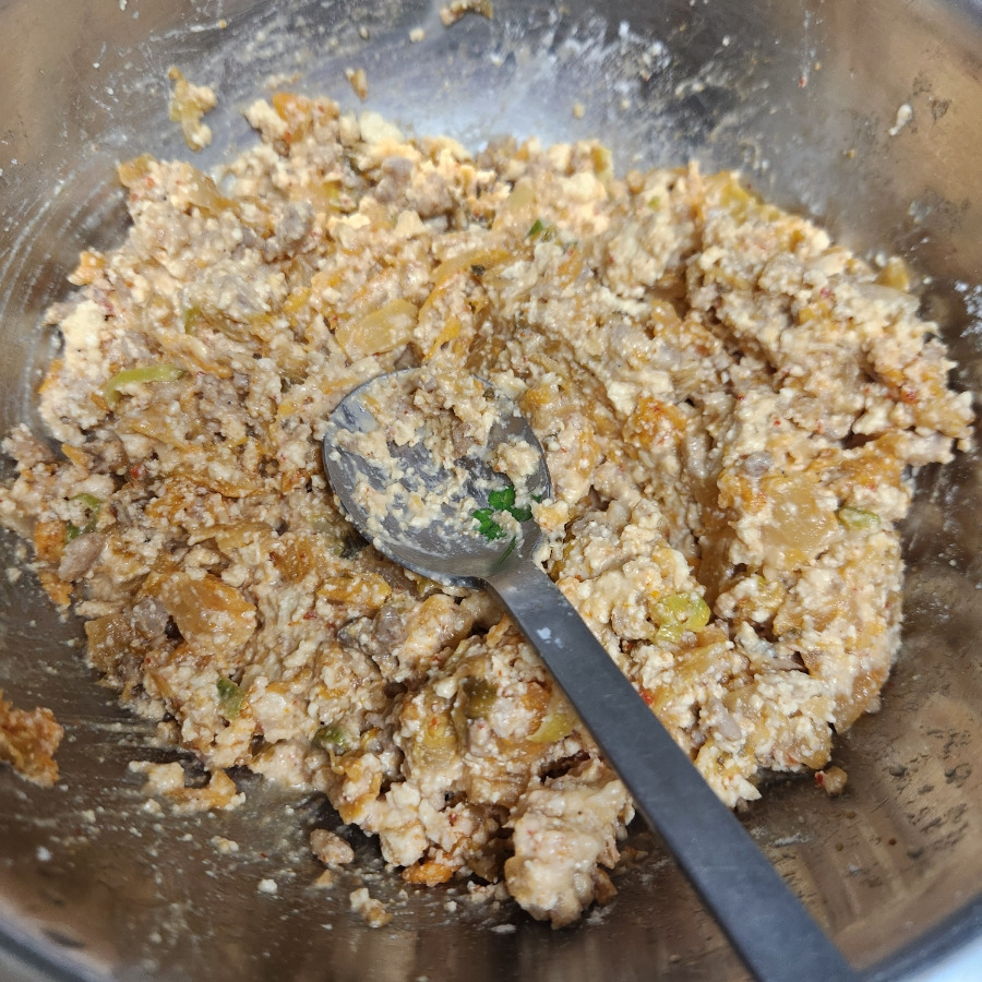 재료: 돼지고기 다짐육(앞다리 500g), 대파 3개, 계란 2개, 진간장 1, 굴 소스 1, 참기름 2, 약간의 소금, 간 마늘 5, 후춧가루 조금, 밀가루 조금, 두부 1모 (물기를 제거한 두부), 생강 가루 조금.