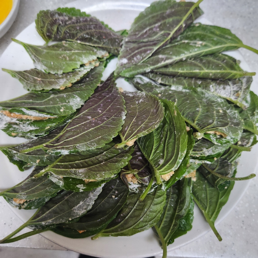 - 소를 넣은 깻잎을 다시 밀가루 옷을 입혀 주고 탈탈 털어 줍니다.
