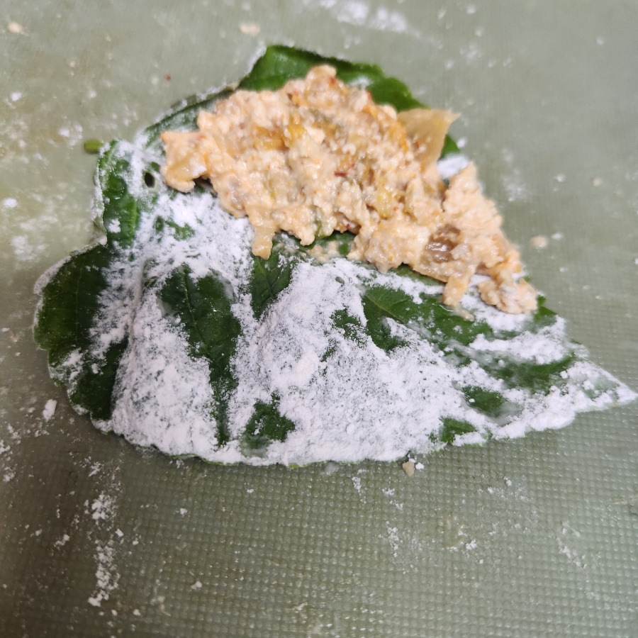 깻잎 안에 밀가루를 살짝 찍고 그 위에 만두 소를 넣었어요. 요렇게 넣지 마시고 한쪽으로 납작하게 넣으면 반으로 접기 좋아요.