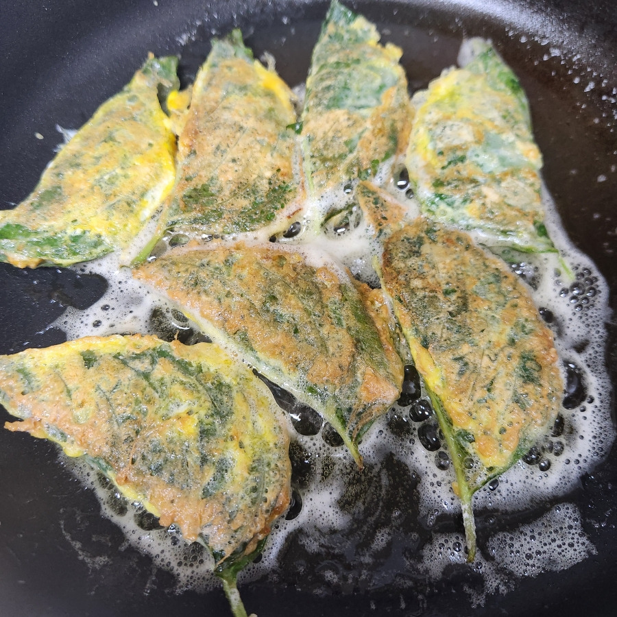 - 밀가루 옷을 입은 깻잎을 계란 물에 풍덩 적셔서 프라이팬에서 중불로 익혀 줍니다.