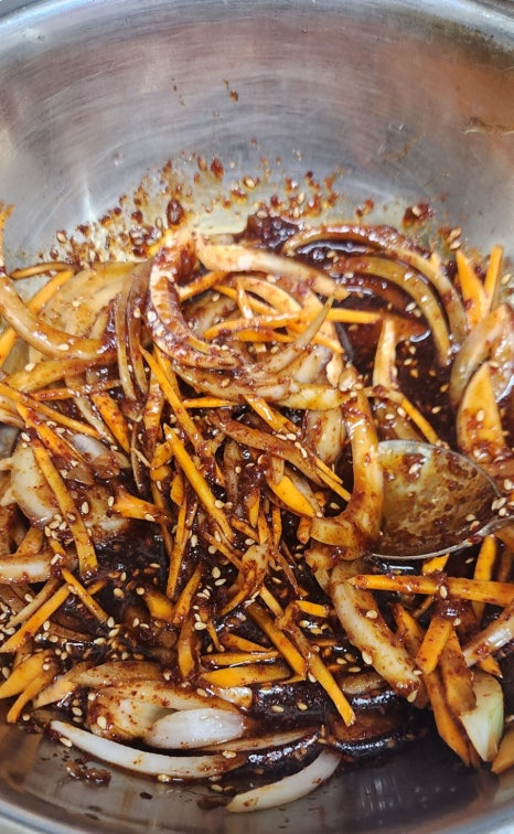 - 양념을 볼에 담가 2의 당근과 양파를 넣어 준비한다.