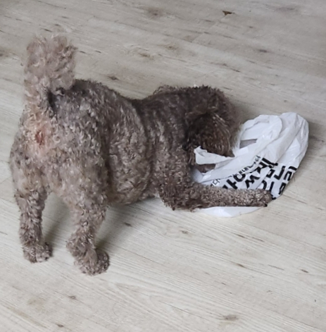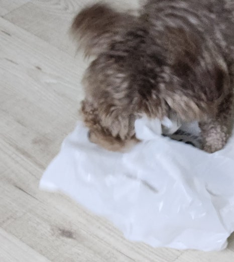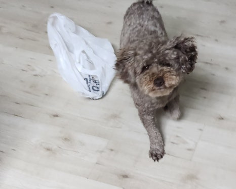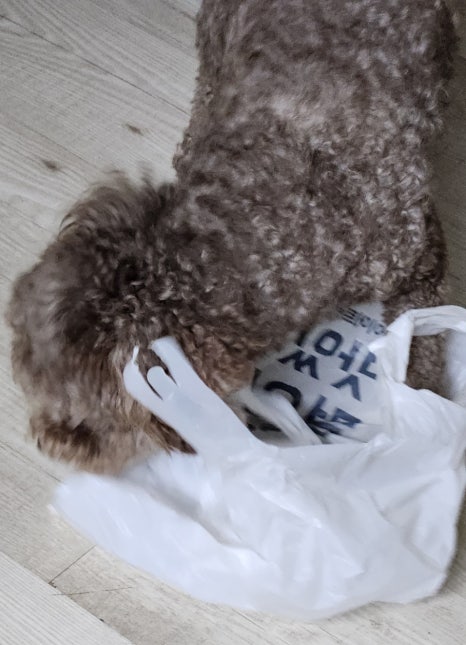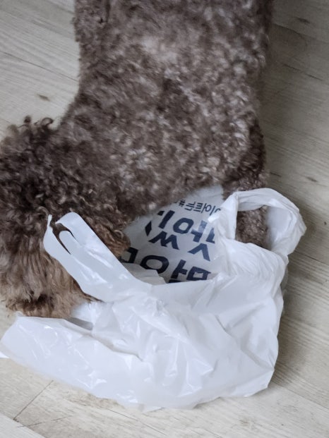 오늘은 맛있는 냄새가 묻어 있는 봉다리를 하나 물고 나왔어요.