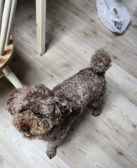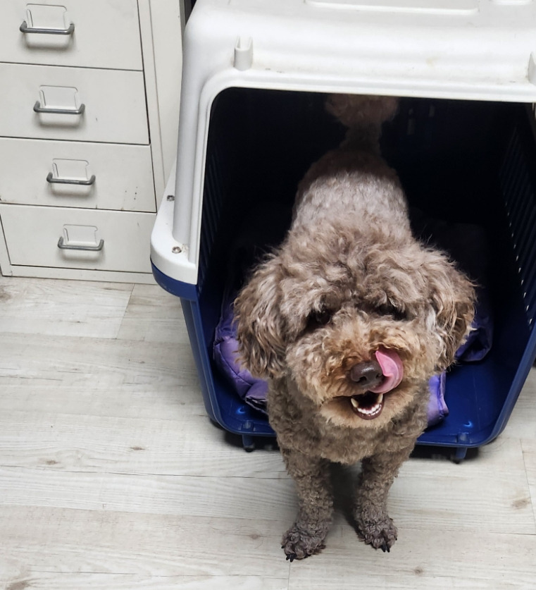 하우스 안에서 꼬기 간식 하나 묵고 기분 좋은 달달한 마루 씨입니다.
