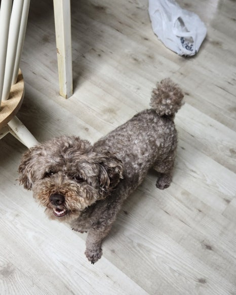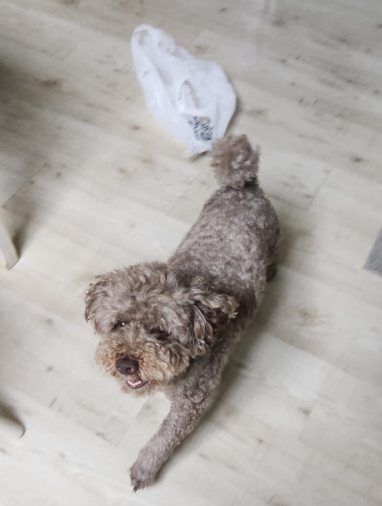 하우스 안에서 꼬기 간식 하나 묵고 기분 좋은 달달한 마루 씨입니다.