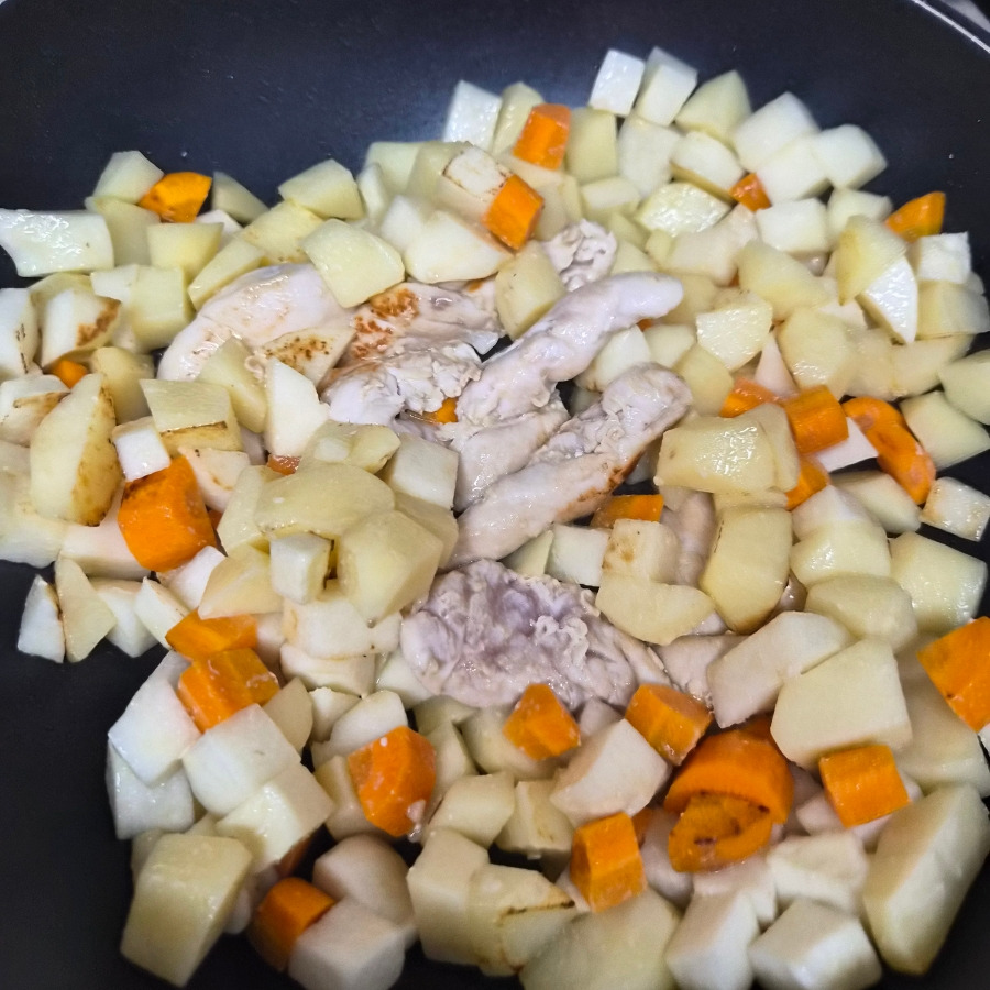 10. 단단한 히카마와 감자 그리고 당근을 넣고 볶다가 닭고기를 넣고 같이 볶아 줍니다.