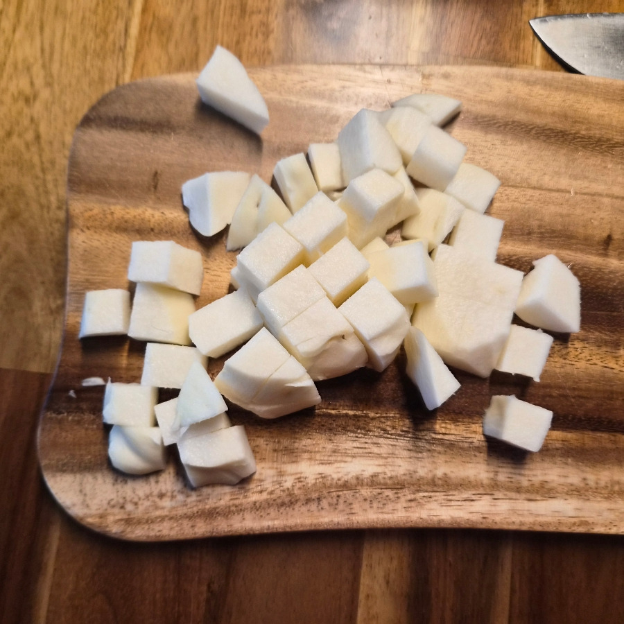 14. 히카마를 잘라요. 깍두기 모양처럼 잘라 줍니다.