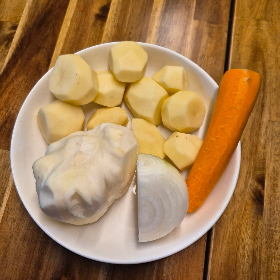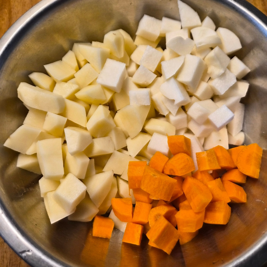 13. 감자와 히카마 당근의 양이에요. 너무 많이 잘랐어요. 소스보다 야채가 더 많겠어요. 달달한 마루 씨 엄마는 늘 양 조절에 실패에요.