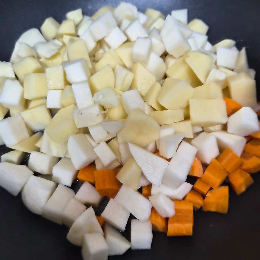 11. 감자는 살짝 물에 헹궈서 볶아 줍니다. 히카마 감자 당근을 웍에 넣고 달달 볶아 줍니다.