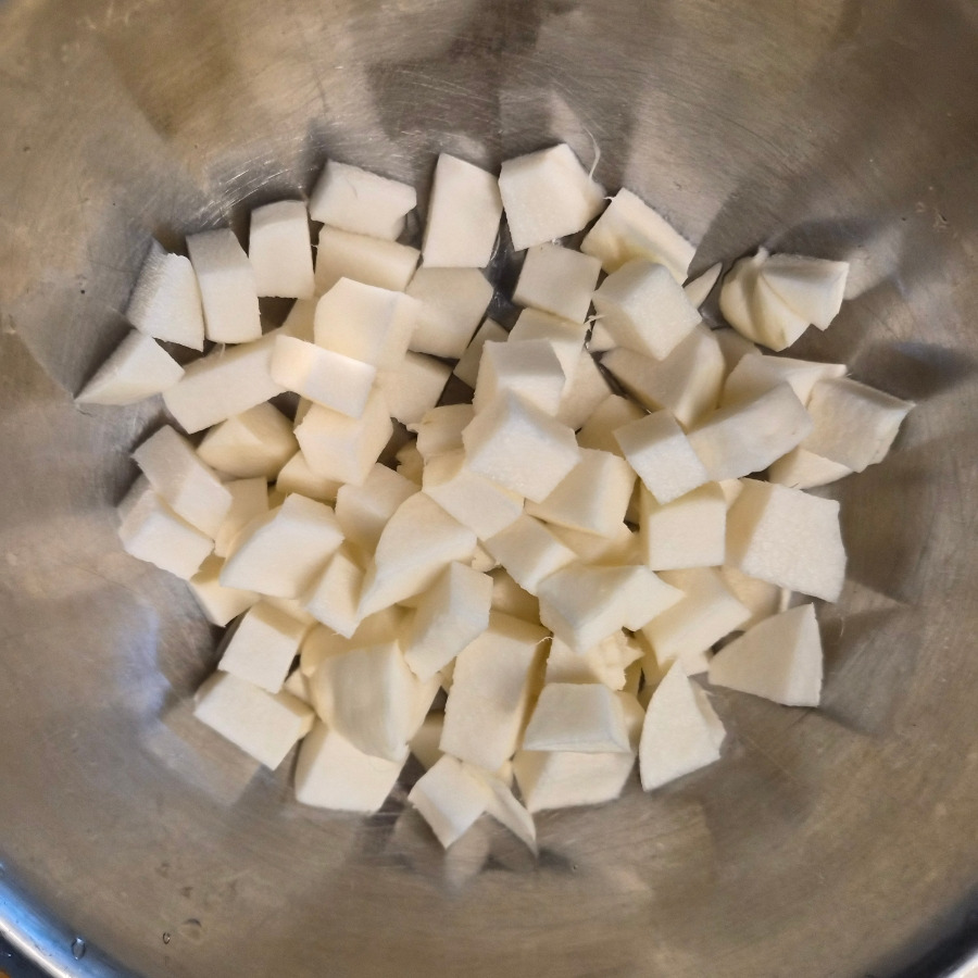 14. 히카마를 잘라요. 깍두기 모양처럼 잘라 줍니다.