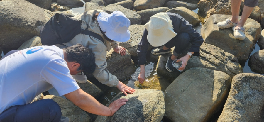 쓰윽~ 도망가기 1등인 게가 쉽게 잡히겠어요? ㅎㅎ 다른 분들 바구니에는 멍게도 해삼도 그리고 게도 있어요. 그리고 조개도 있고요. 아이들의 놀이터입니다. 어른들의 놀이터입니다. 어른들도 모두 바위 밑으로 손을 넣어요. 모두 재미납니다. 물도 낮아서 아이들의 놀이터로 참 좋아요.