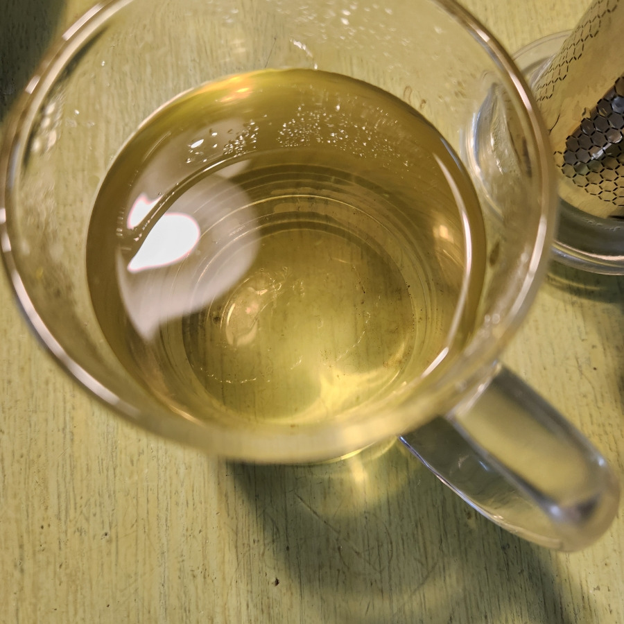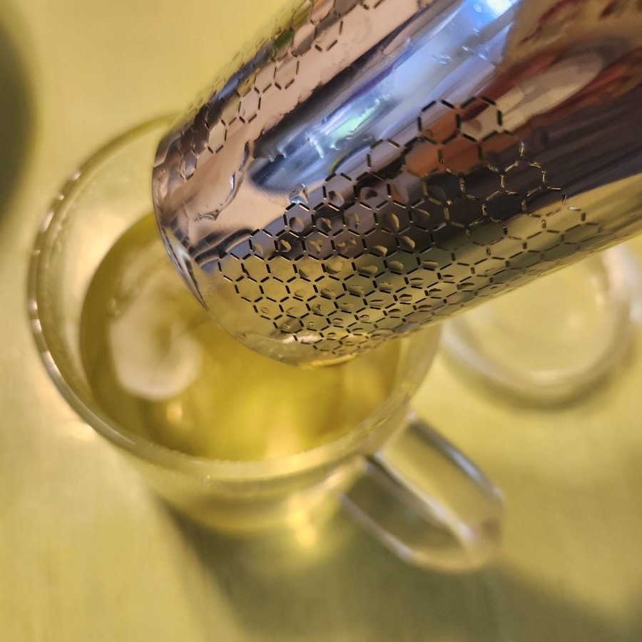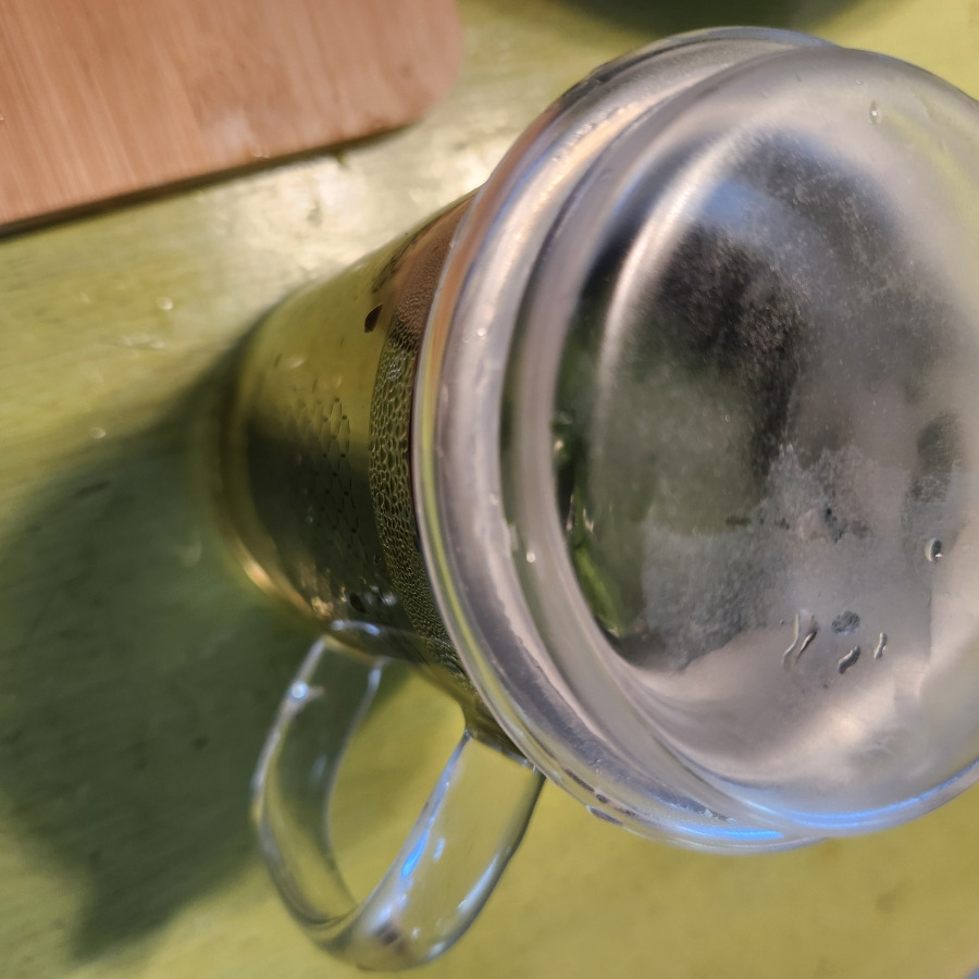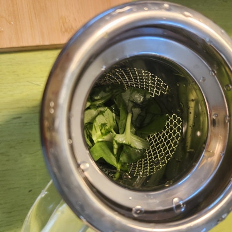 물을 붓고 한참을 기다려 차 망을 꺼내요. 미지근한 바질 차가 완성되었어요.