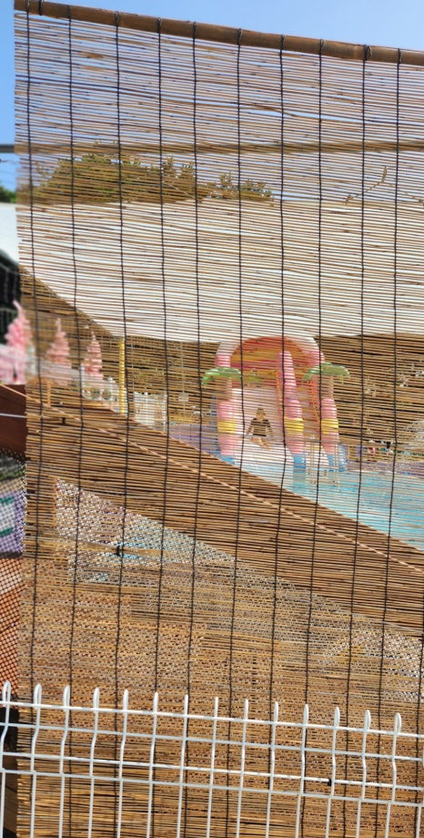 길 옆으로 보이지 말라고 대나무 발로 차단 그리고 수영장 위에 타프가 있어 뜨거운 자외선으로부터도 편안하게 수영을 할 수 있어요. 수영장의 깊이가 제법 있어서 아주 재미나게 놀았습니다. 울 1호는 신이 났지요. 바다에서 놀지 못한 한을 요기서 그나마 풀어 봅니다. 아가들을 위한 미끄럼틀까지~ 완벽합니다.