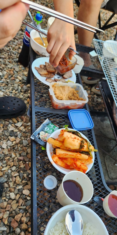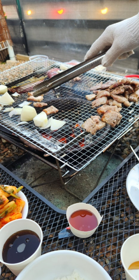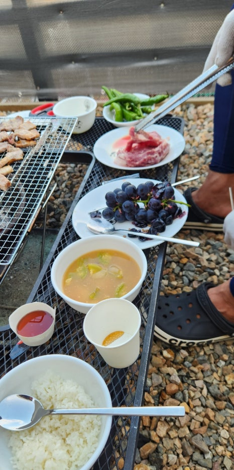 바비큐~불을 신청하면~ 숯을 얌전하게 준비해 주십니다.(바베큐 2만 원 추가) 집에서 준비해서 갑니다. 소고기, 돼지고기 목살, 삼겹살~ 살살 구워 먹었지요. 불이 얌전하게 올라 타지 않고 편안하게 앉아서 먹을 수 있었어요. 야외에 선풍기도 준비되어 있어서 시원하니 먹네요. 맛나게 잘 먹었습니다. 김치는 급히 지마켓에서 한상궁 김치를 준비해서 갔어요. 저도 처음 시켰는데 맛나네요. 다음에도 재구매하고 싶은 김치입니다. 총각김치 맛나게 잘 먹었습니다.