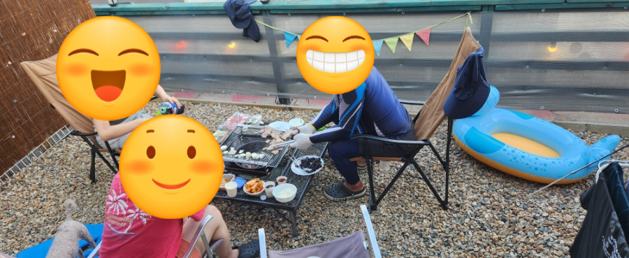 인테리어 업자 농부님이 가지고 싶어 하던 캠핑 테이블입니다. 편안하게 밥을 먹을 수 있어 좋았지요. 위에 바베큐 그릴에도 구울 수 있고요. 요렇게 아래 테이블에서 구울 수 있어요. 먹을 장소를 선택하시면 거기에 맞춰 준비해 주십니다. 옆에 사용도 못 하고 아빠 핸드백처럼 들고 당긴 물개 튜브도 오늘 수고 많이 했네요. ㅋㅋ
