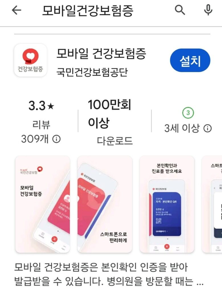 모바일 건강 보험증은 구글 플레이 스토어에서 받으세요. 설치 후 본인 확인만 하면 됩니다. 신분증이 없어도 모바일로 간단하게 만들면 됩니다.