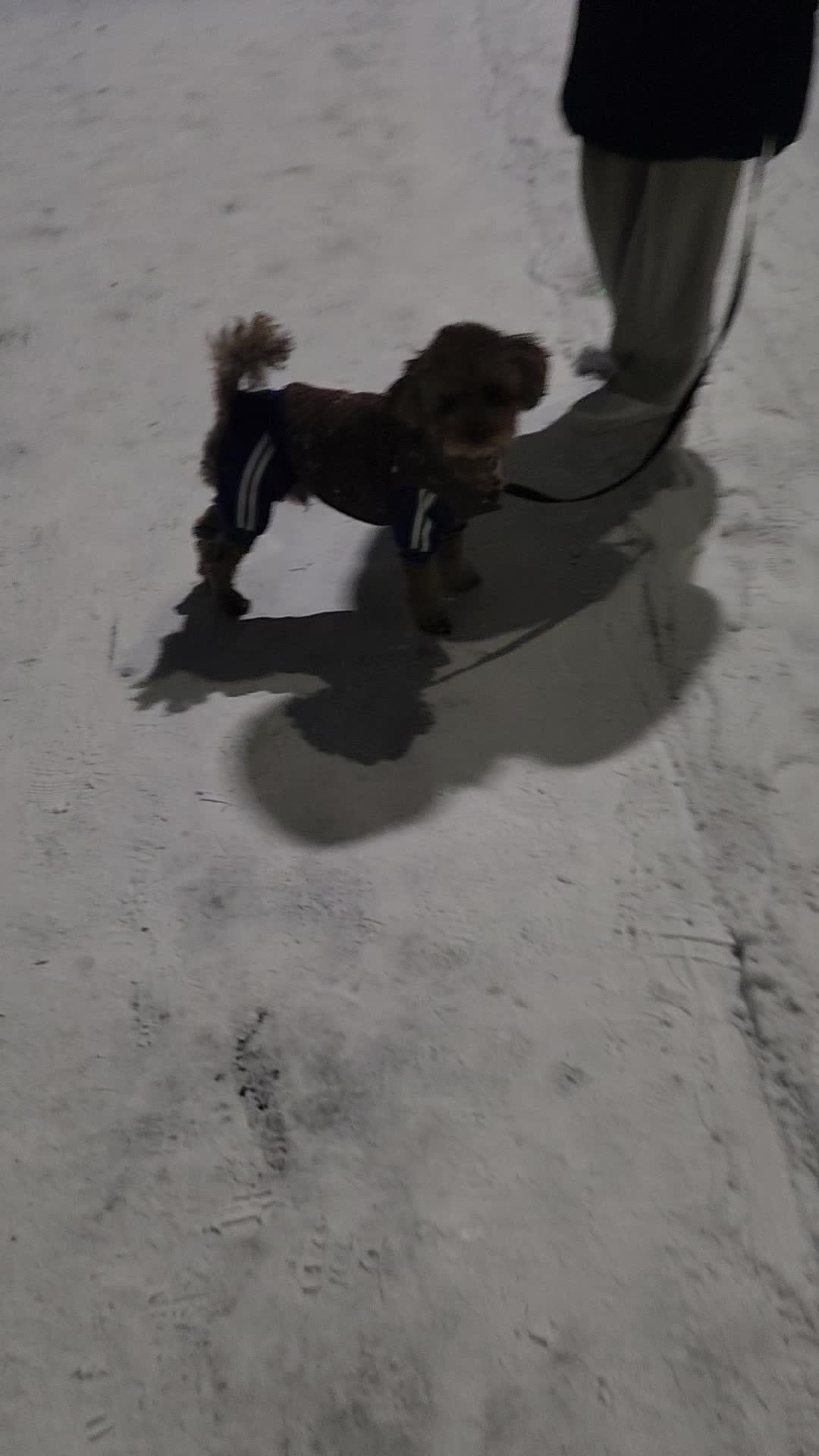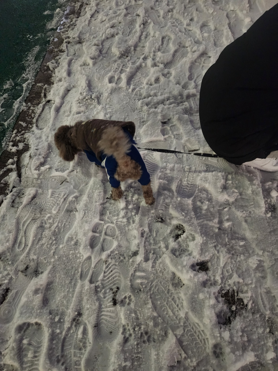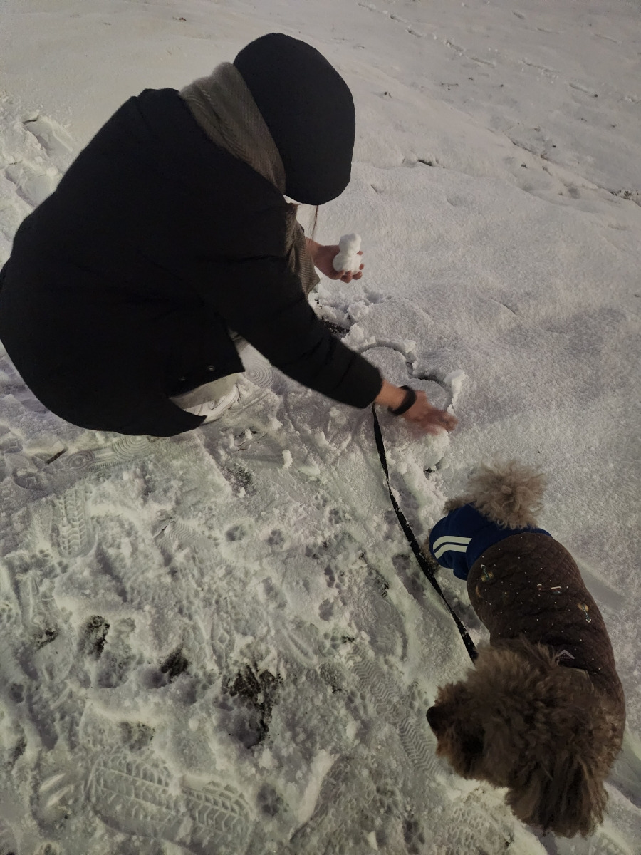 눈을 밟으며 산책하고 있어요.
