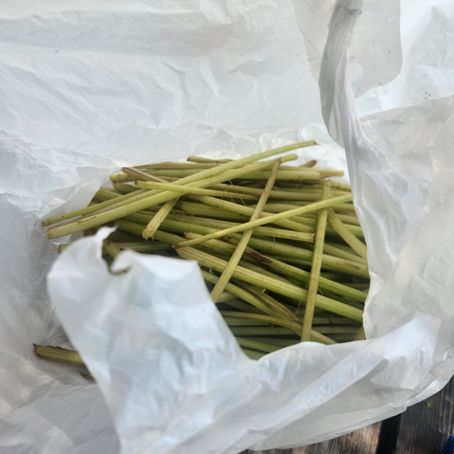 차광막 아래에서 머위 잎을 꺾어서 쭉~ 잡아당기면 머위 줄기의 섬유질이 벗겨집니다.