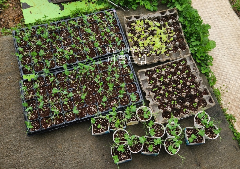 비 오는 주말 달달한 마루씨네 밭에 완두콩, 바질, 상추 함박꽃을 심어요.