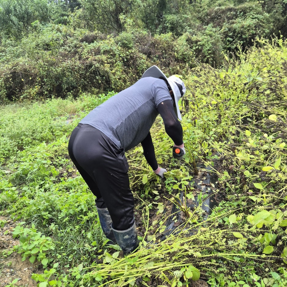 겸손한 자세로 허리를 숙여 들깨 아래로 들어가 들깨 허리춤을 잡고 낫으로 당겨줍니다.