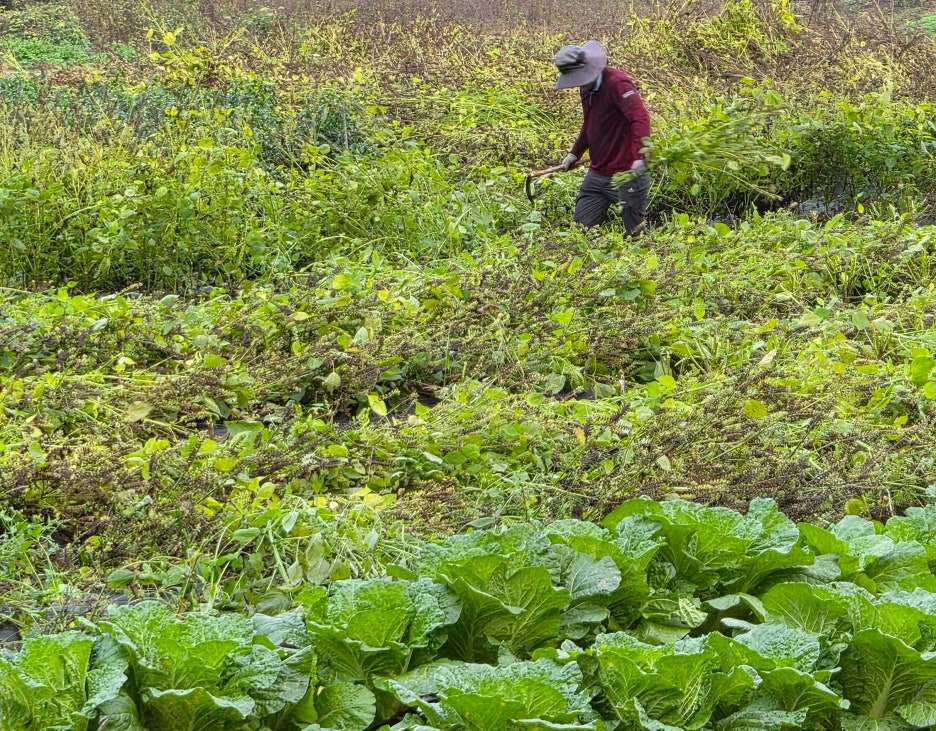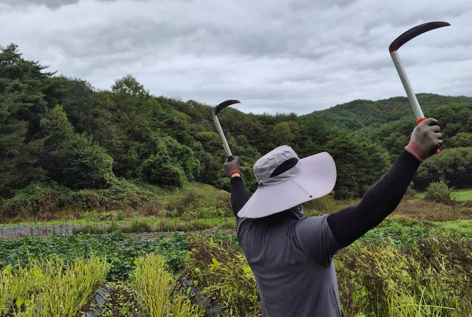 위험한 낫을 들었으니 더 조심해야 해요. 그리고 비가 와서 땅도 질고 더 집중해서 일을 해야 합니다.