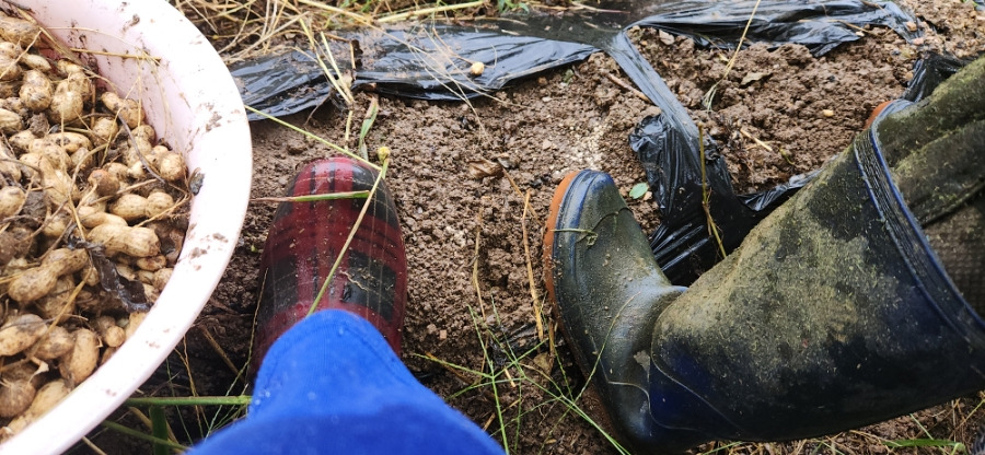 갑자기 내리는 비에 땅콩 캐기를 멈춥니다.