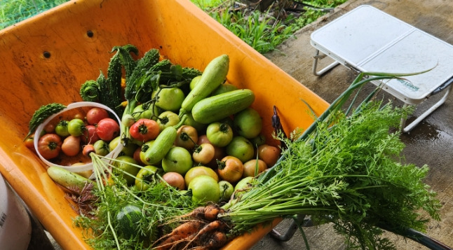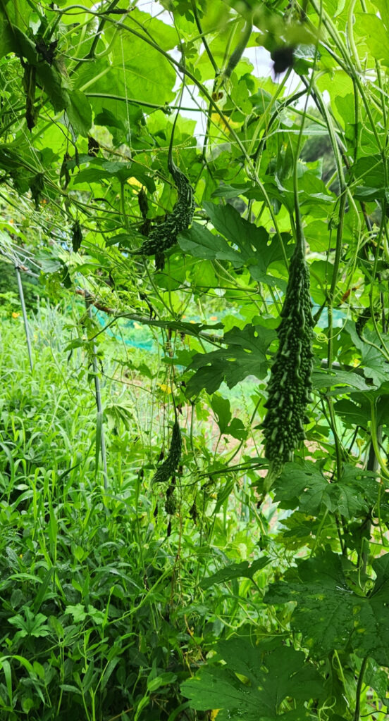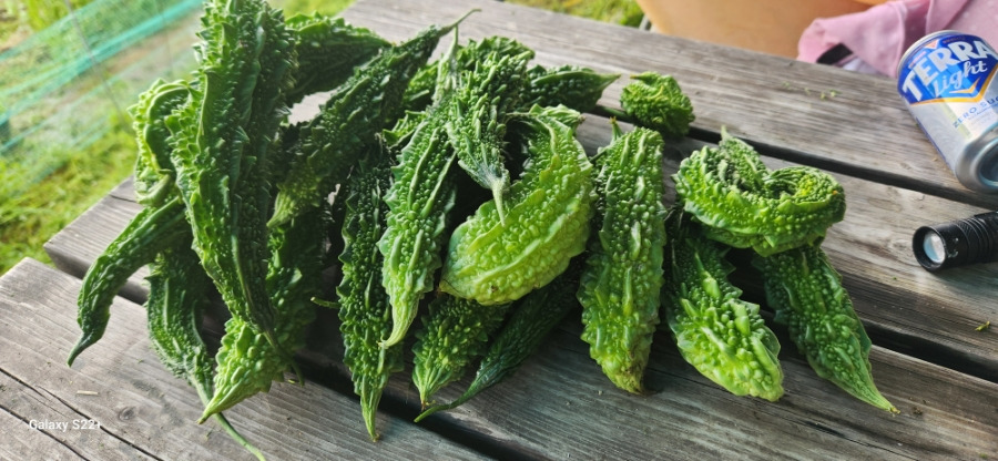 밭에서 수확한 여주에요. 1주일 안에 이만큼 땄어요. 지난주에도 4개를 땄는데~엄청나요.