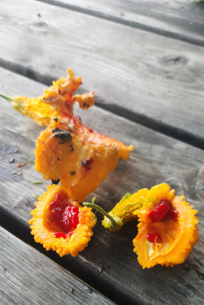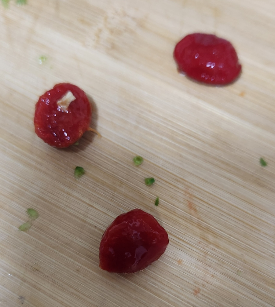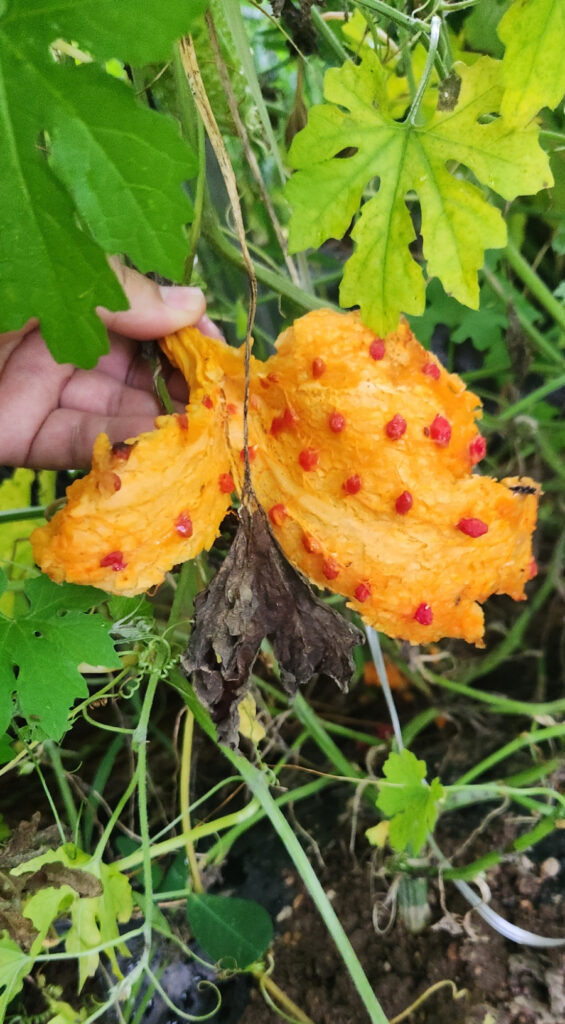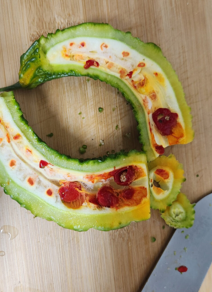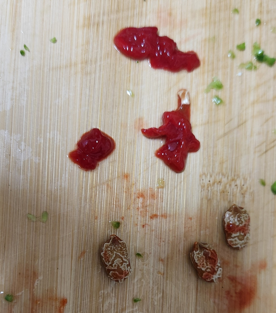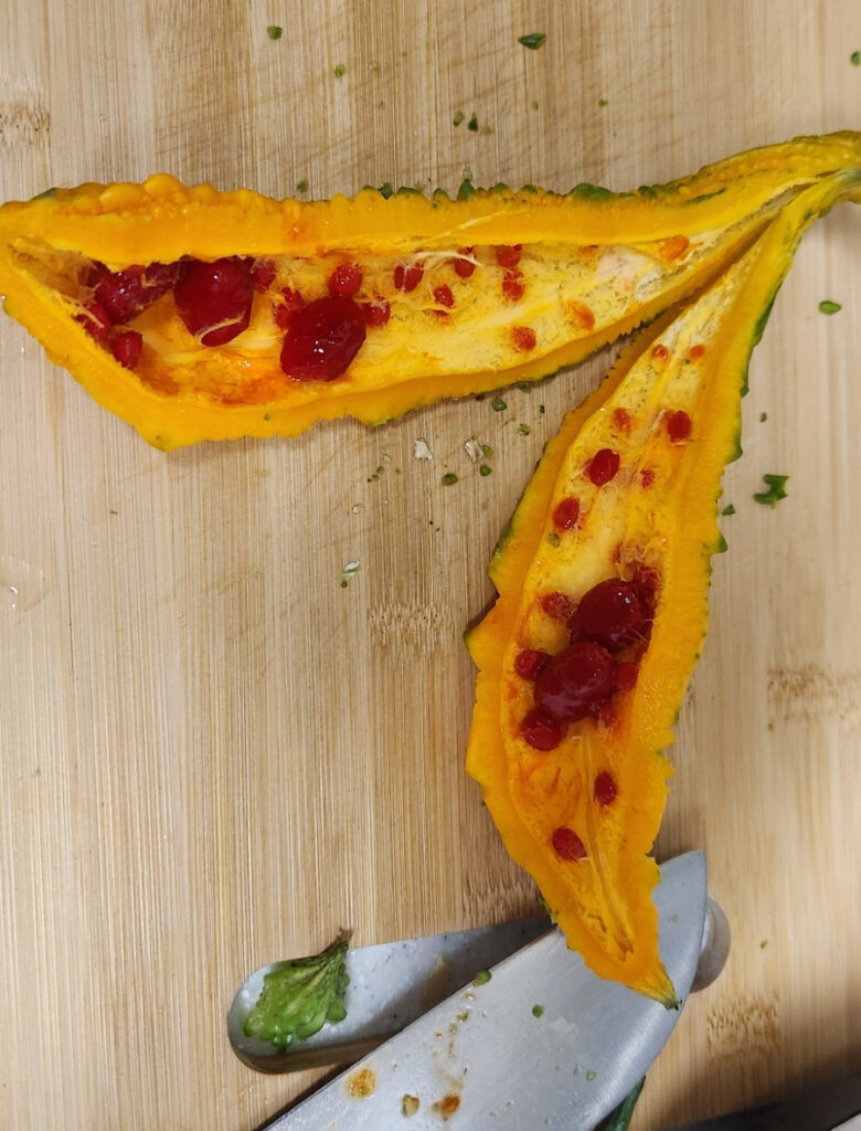 노랗게 익은 여주의 배를 갈랐어요. 안에 물컹한 빨강 젤리들이 듬뿍~~