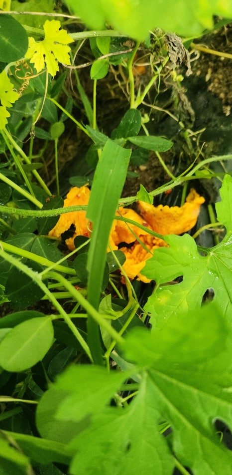 여주와 수세미 사이에 잡초와 함께 땅콩이 자라고 있어요.