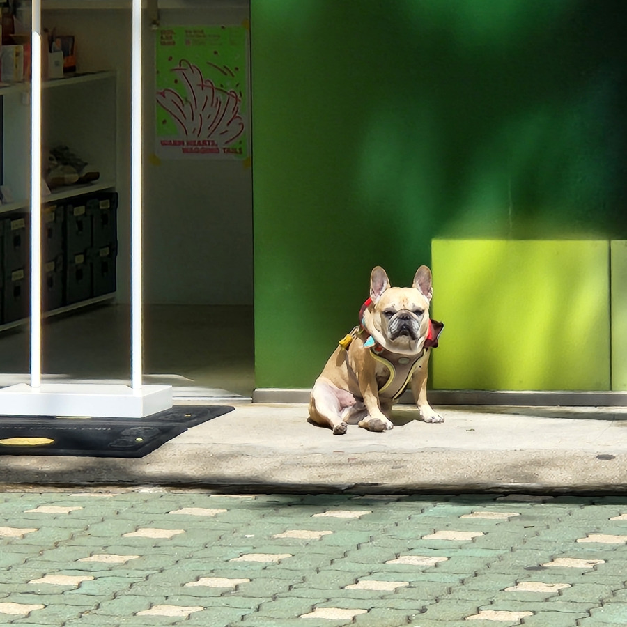 저 멀리 인형처럼 앉아 있는 강아지를 봅니다.