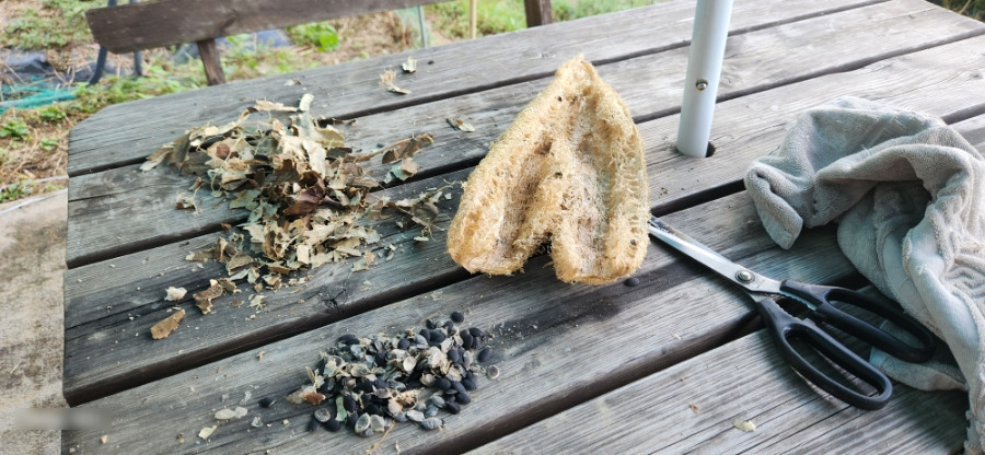 안에서 나온 씨앗과 껍질입니다. 수세미 1개 안에서 나온 씨앗이 수북해요. 요기서 똘똘한 씨앗들을 챙기면 내년 씨앗은 문제없겠어요.