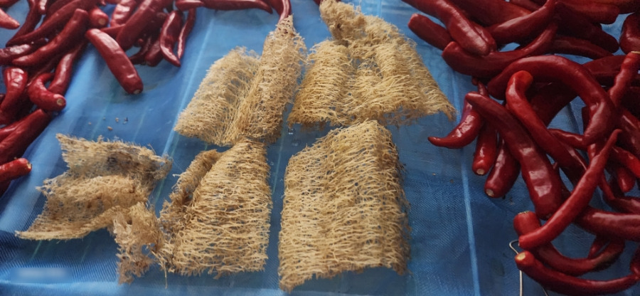 빨래 건조대에 망을 깔고 고추를 말리고 있었는데 살짝 옆으로 밀어 놓고 수세미를 말렸어요. 밤에 올렸더니 아직 촉촉합니다.