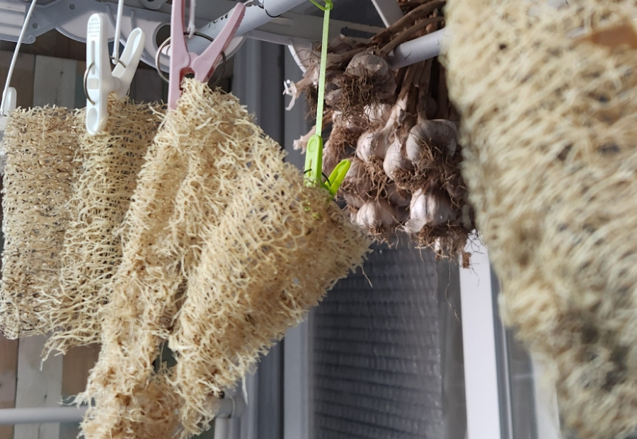어여~ 꺼내서 마늘 까야 하는데 자꾸 미루고 있어요. 저렇게 두다가 다~ 말리는 수가 있지요. ㅎㅎ유경험자로 말씀드립니다. 얼른 정리해서 냉동실에 꽝꽝 얼려야 오래 두고 먹을 수 있어요.수세미를 바람 부는 베란다에서 말리면 2-3일 정도면 바짝 마르겠네요.